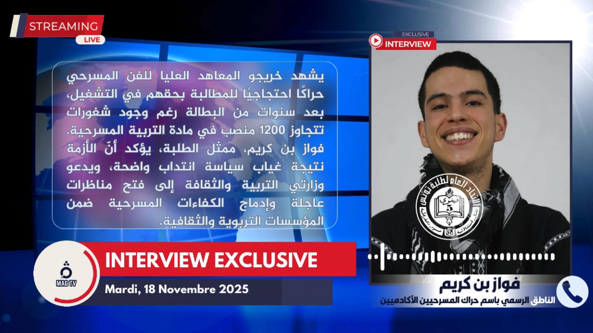 وفي تصريح حصري لـ MAG TV، أكّد فواز بن كريم، ممثل طلبة المعهد العالي للفن المسرحي والناطق الرسمي باسم الحراك، أن الأزمة لم تعد قضية فردية بل «ملف وطني مؤجل منذ سنوات». وقال: